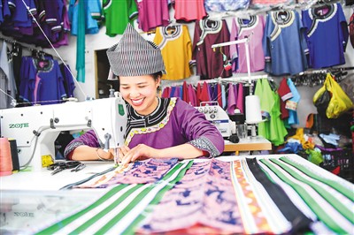 在古州鎮(zhèn)老街,水族服裝店店主在制作水族服飾。