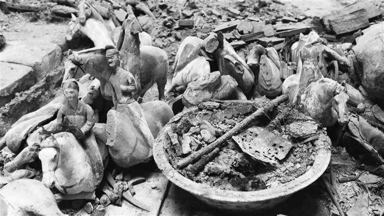 甬道及墓室內(nèi)隨葬品眾多,有彩繪陶、漆木、石、銅、鐵、金銀器及革制和絲麻織品等,共計(jì)220余件組。從發(fā)掘現(xiàn)場來看,這座墓葬保存非常完整,沒有被盜和攪擾的痕跡。