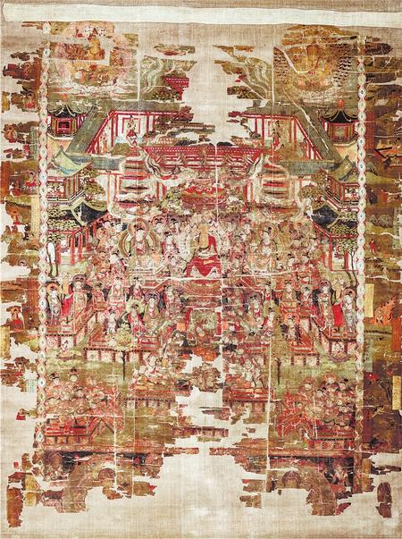 與西方凈土阿彌陀相應(yīng)的是藥師如來(lái)的東方凈土,藥師信仰曾在敦煌地區(qū)極為流行。本圖可能是存世敦煌絹畫(huà)中最大的一幅,在構(gòu)圖方面可與敦煌石窟壁畫(huà)中最復(fù)雜的凈土圖相媲美,是敦煌繪畫(huà)中十分罕見(jiàn)的超大型絹畫(huà)。