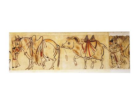 畫(huà)中描繪的是一匹馬和一頭雙峰駝,馬前有一位牽引的人,駝后畫(huà)面斷開(kāi),右端后續(xù)殘畫(huà)可見(jiàn)又一牽馬之人(人與馬均不完整)。
