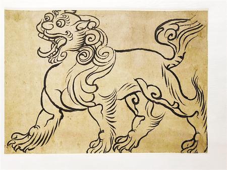 中國(guó)本無(wú)獅子,原產(chǎn)地是非洲和南美洲,約在漢武帝時(shí)才經(jīng)西域傳入。獅子作為進(jìn)獻(xiàn)的禮物,是敦煌壁畫(huà)中最早出現(xiàn)的動(dòng)物形象之一。由于它的勇猛威儀備受佛教推崇,故在造像和壁畫(huà)中曾出現(xiàn)大量的獅子元素。除此,獅子形象還被吸納成為陵墓裝飾和傳統(tǒng)建筑的基本元素。這幅紙本畫(huà),造型準(zhǔn)確、健壯飽滿,昂首闊步、氣宇軒昂,線條遒勁、中鋒用筆,彈性十足,顯示出畫(huà)家嫻熟的造型功底,長(zhǎng)短弧線勾勒卷毛,寥寥數(shù)筆,卻靈動(dòng)活潑、灑脫不羈,為不可多得之線描精品。