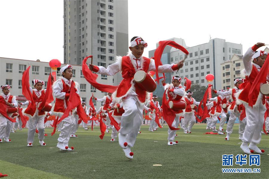 11月4日,蘭州市桃樹坪小學(xué)學(xué)生在活動現(xiàn)場表演歡慶腰鼓。當(dāng)日,甘肅省蘭州市城關(guān)區(qū)學(xué)校體育“一校一品”現(xiàn)場展示活動在蘭州市第五十四中學(xué)舉行,16所學(xué)校進(jìn)行了特色校園體育項目表演。據(jù)介紹,蘭州市城關(guān)區(qū)現(xiàn)已推廣各類體育項目40余項,命名“體育特色項目示范校”42所。 新華社記者 張智敏 攝