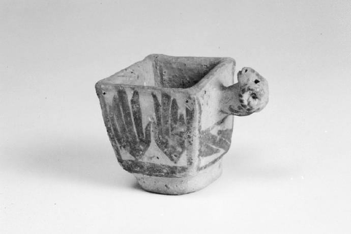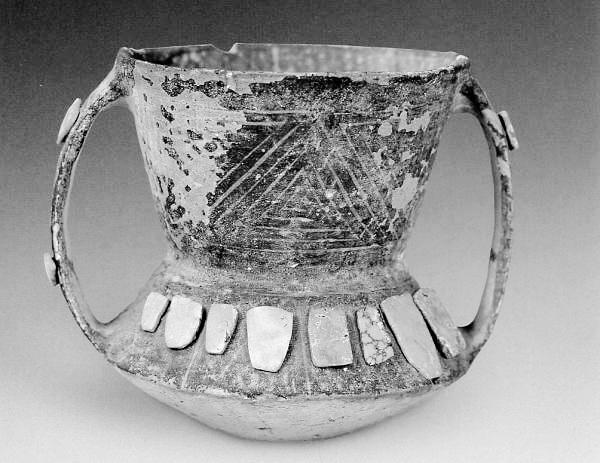 另一件人形三角折帶紋雙足罐,單耳,夾沙紅陶質地,高約11厘米,圓鼓的肚子,身著黑色帶狀紋、豎條紋和“Z”字形紋的華麗衣衫,足穿一雙平底大鞋,鞋頭尖而深,似乎是一個孕婦形象。這可能是3700年前女性著裝的樣式。
