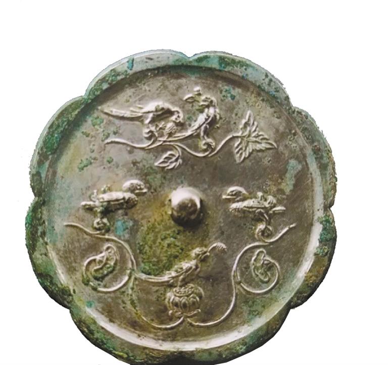 隋唐時(shí)期是中國(guó)封建政治經(jīng)濟(jì)文化高度發(fā)展繁榮的時(shí)期,唐代社會(huì)經(jīng)濟(jì)全面發(fā)展,手工業(yè)各部門也都興旺發(fā)達(dá),青銅鑄造業(yè)中的銅鏡業(yè)尤為突出,無(wú)論造型、題材、紋飾、鑄造工藝,都突破了前代的模式,達(dá)到了中國(guó)古代銅鏡藝術(shù)的巔峰。唐鏡鏡型厚實(shí),方形鏡、菱花形鏡、葵花形鏡流行;紋飾題材多見(jiàn)瑞獸、飛鳥(niǎo)以及葡萄、花草等;瑞獸葡萄鏡最具特色,是中西文化融合的杰作。