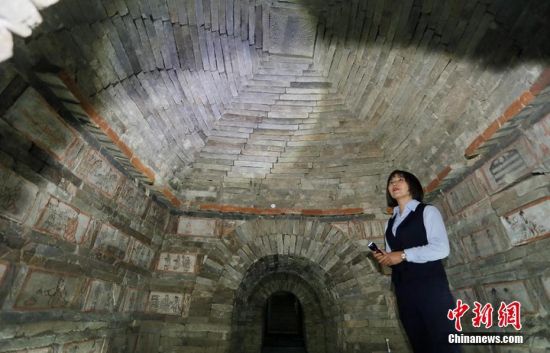 位于甘肅嘉峪關(guān)市的嘉峪關(guān)新城魏晉墓群,內(nèi)有千余座魏晉古墓,從1972年起,先后發(fā)掘18座,其中9座為畫像磚墓。磚壁畫取材于現(xiàn)實生活,用連環(huán)畫的方式反映出了當(dāng)時河西地區(qū)生活、生產(chǎn)、軍事、文化的真實情景,具有濃厚的生活氣息。目前只開放的六號墓,其壁畫內(nèi)容豐富,具有很強的代表性。高展 攝