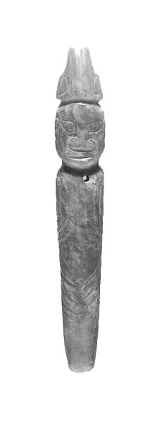 兩件玉人,一為白玉,玉人裸體直立,發(fā)辮虎首蛇身盤(pán)成堆髻。長(zhǎng)臉,闊鼻,深眼窩,大耳,厚唇前突,兩手捧腹,神情肅穆,玉人背部可見(jiàn)雙臂肘,以及脊柱凹槽。兩腿間“8”形鏤空,雙足并攏作鏟形,有斜刃。玉人無(wú)明顯性別特征,但從身軀面相可判定是男性。