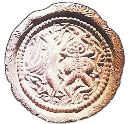 陜西淳化縣博物館收藏著一枚蟾蜍玉兔紋瓦當(dāng)。這枚蟾蜍玉兔紋瓦當(dāng)是國家一級文物,出土于咸陽市淳化縣西漢甘泉宮遺址。瓦當(dāng)面分上、下兩部分,上半部浮雕的是一只疾奔的小兔,兩前足躍起,雙耳后豎,尾巴上翹;下半部是一只起跳的蟾蜍,圓目突起,大腹鼓圓,舌長伸。瓦當(dāng)造型生動傳神,極富生活情趣。在我國古代神話傳說中,蟾蜍、玉兔是月宮里的動物,這個構(gòu)圖無疑是取自嫦娥奔月的神話故事。