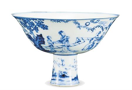 我國自古就有賞月祭月的習(xí)俗,這一習(xí)俗在文物里也有體現(xiàn),湖北省博物館收藏了一件青花瑤臺賞月圖瓷鍾。瓷鍾通高10.1厘米,口徑15.5厘米,足高4.6厘米,足徑4.2厘米,屬官窯出品,白胎,胎質(zhì)細(xì)膩,器壁光亮胎薄,叩之其聲如磬。瓷鍾上繪有“瑤臺賞月圖”,三組人物故事現(xiàn)于瓷鍾外壁:第一組有一老婦人側(cè)身坐在石墩上,身后站一侍女,雙手持扇,老婦對面站一年輕女子,其右側(cè)立一童子。第二組和第三組各有一青年女子和丫環(huán),畫面還有遠(yuǎn)山、祥云和花草。“瑤臺賞月圖”紋飾在瓷器界又被稱為“人物紋”,較為罕見,圖中人物共賞天上一輪圓月,與宋人所繪《瑤臺步月圖》一脈相承,意境優(yōu)美,風(fēng)格清新動人。