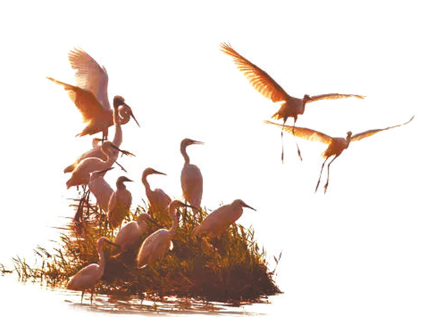 去年12月底,一位老師來西峰講學,我陪先生到濕地海綿公園轉悠,剛剛步入人行道,發(fā)現(xiàn)遠處湖水中央有七八只白鷺在棲息,朝陽斜射到湖面上,水波瀲滟,像細碎的金斑,白鷺安詳?shù)叵礈熘鹈?,有一只白鷺單腿直立著,恰似依著一根筆直纖細的鐵絲,半張著翅膀,欲飛不飛的樣子,剩下的幾只白鷺在戲水,迷人極了。