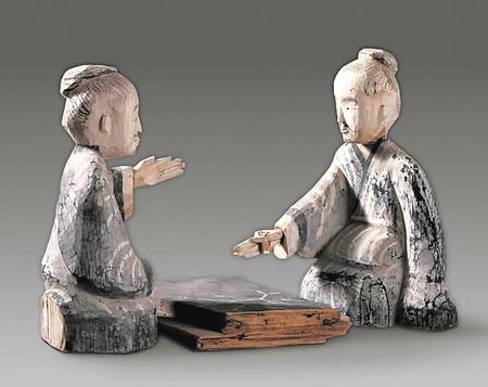 武威市磨嘴子出土的西漢彩繪 對(duì)弈六博俑
