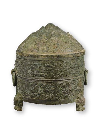 樽為古代盛酒的器具。李白《行路難》云:“金樽清酒斗十千,玉盤珍羞直萬(wàn)錢。”考古發(fā)現(xiàn)的酒樽最早出現(xiàn)在戰(zhàn)國(guó)時(shí)期,漢代酒樽常與杓、承盤等酒具配套使用。此件銅樽裝飾紋飾繁縟華麗,制作工藝精湛細(xì)膩,是東漢青銅冶煉技術(shù)的杰出代表。