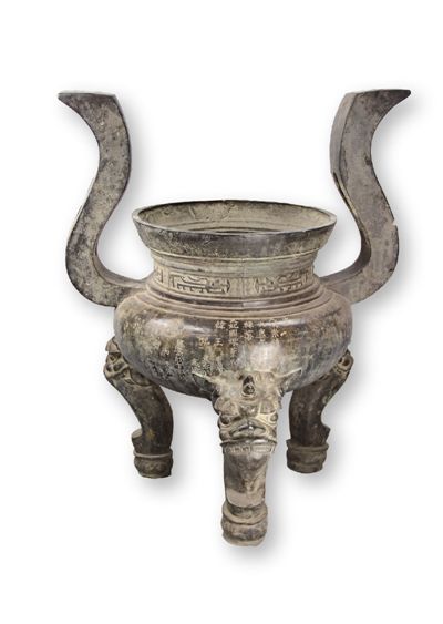 該銅爐(圖⑤)通高101厘米、口徑49.3厘米。爐器形碩大,造型精美,整體呈鼎形,侈口斜沿,內(nèi)折窄唇,束頸,溜肩,S形對(duì)稱高耳,鼓腹,圜底,獸面吐舌形三高足,足跟缽形。頸上部飾凸弦紋,中部浮雕夔龍六條,雷紋襯地;肩部飾二道凸弦紋;腹部鏨刻“時(shí)大明崇禎三年歲次庚午季春,韓藩太妃國(guó)母董氏、韓王亶嵴妃慕容氏造”及紀(jì)年、造者、監(jiān)造、工匠等59字銘文。據(jù)銘文,此爐為明代第十一代韓王朱亶嵴所鑄,是研究明代韓王歷史的珍貴文物。