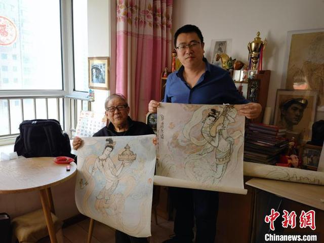 3月上旬,《絲路花雨·誕生》作者陳曉斌(右)拜訪今年86歲的舞美設(shè)計(jì)師李明強(qiáng)(右)老先生。 王先孟 攝