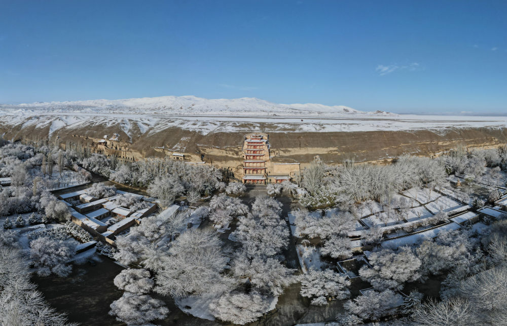 這是3月25日拍攝的敦煌莫高窟景區(qū)雪景(無人機(jī)照片)。新華社記者張智敏 攝