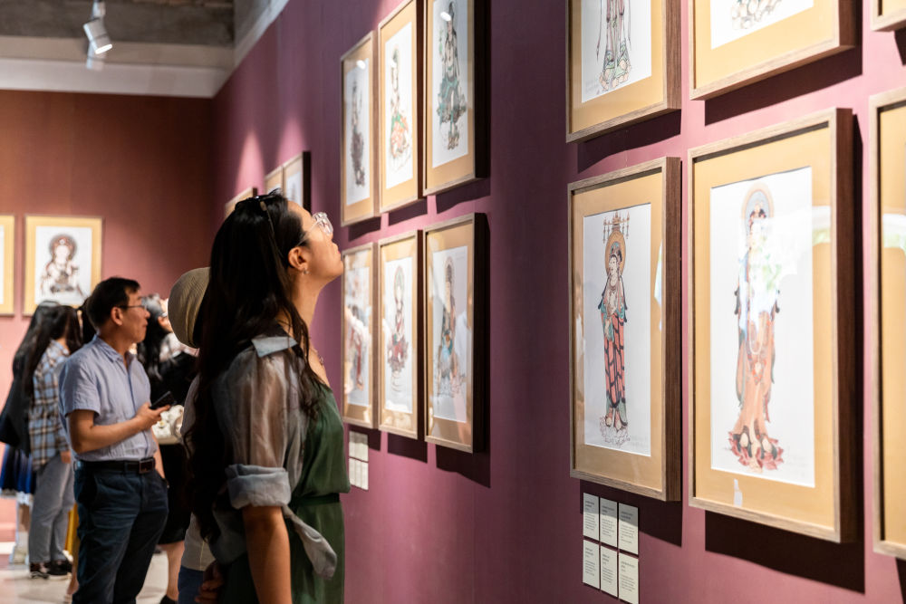此次展覽分為菩薩服飾、天人服飾、世俗人物服飾等板塊,展品包括畫稿、藝術(shù)再現(xiàn)服飾、創(chuàng)新設(shè)計服飾、文創(chuàng)產(chǎn)品等,較為全面地反映了唐代服飾的面貌。