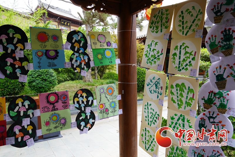 天水古城里的長廊上展示著孩子們的繪畫、手工作品,將兩側(cè)長廊掛滿,不少人駐足觀賞。