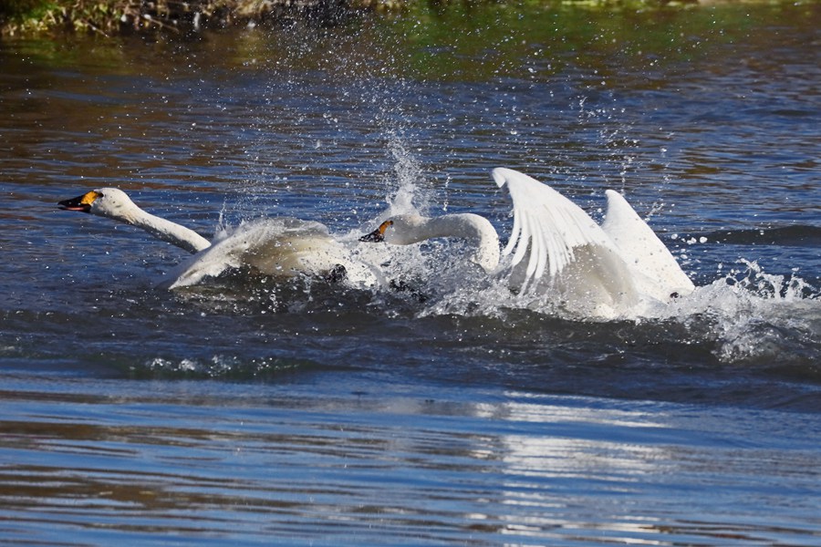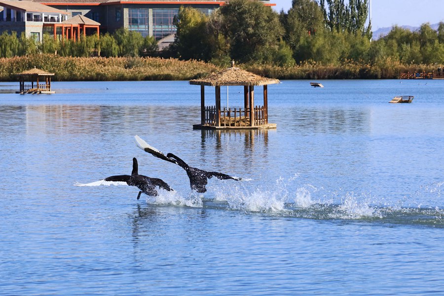 張掖國家濕地公園內(nèi),天鵝聚集在一起嬉戲。方艾琴攝