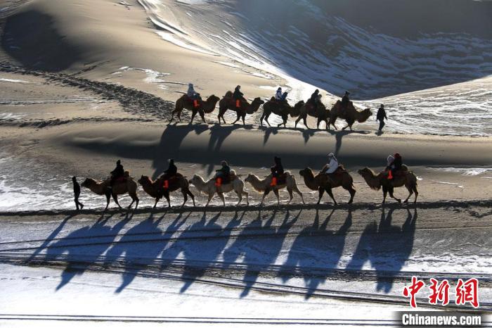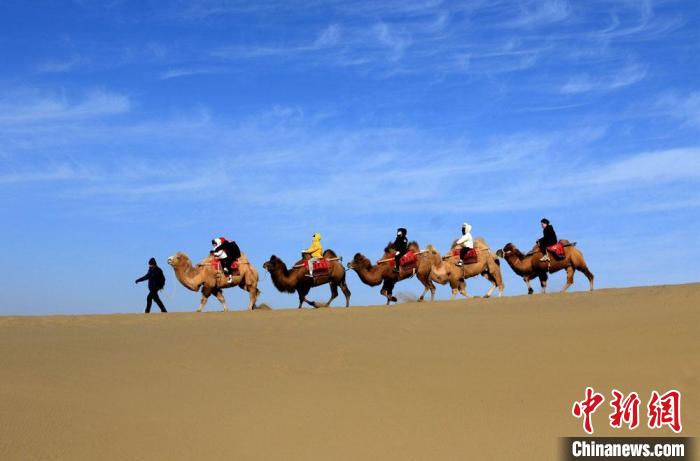 1月27日,游客騎駱駝暢游敦煌鳴沙山。魏佳秀 攝