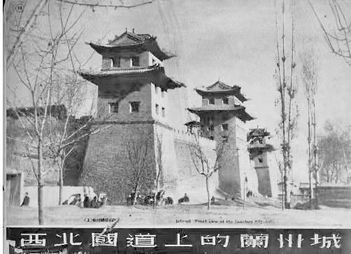 特別難得的是,他拍下了一張?zhí)m州城樓的照片,這是筆者見(jiàn)過(guò)的所有蘭州城樓中最壯觀的。照片上,中間的城門(mén)和兩個(gè)角樓并行排列,角樓前面是幾株西北地區(qū)常見(jiàn)的高聳挺拔的白楊樹(shù),角樓底下是幾個(gè)正在等客人的黃包車(chē)夫。這座城樓是蘭州東郭城門(mén)迎恩門(mén),俗稱東稍門(mén)(位于今東方紅廣場(chǎng)東口什字),中間有城門(mén)洞,南北兩側(cè)為角樓,無(wú)城門(mén)洞。