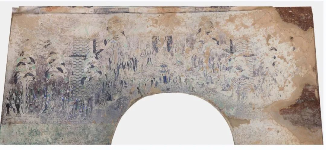 其中飛天裝飾技法的創(chuàng)新令人稱奇,如散花樓后室外側(cè)上方中間五組伎樂飛天的面部、手、足、樂器等均采取淺浮塑方式,而發(fā)髻、服飾、瓔珞、花卉、流云等則繪制而成,兩者之間的結(jié)合天衣無縫,構(gòu)成了一幅幅栩栩如生、熱烈歡快的佛國圣境。