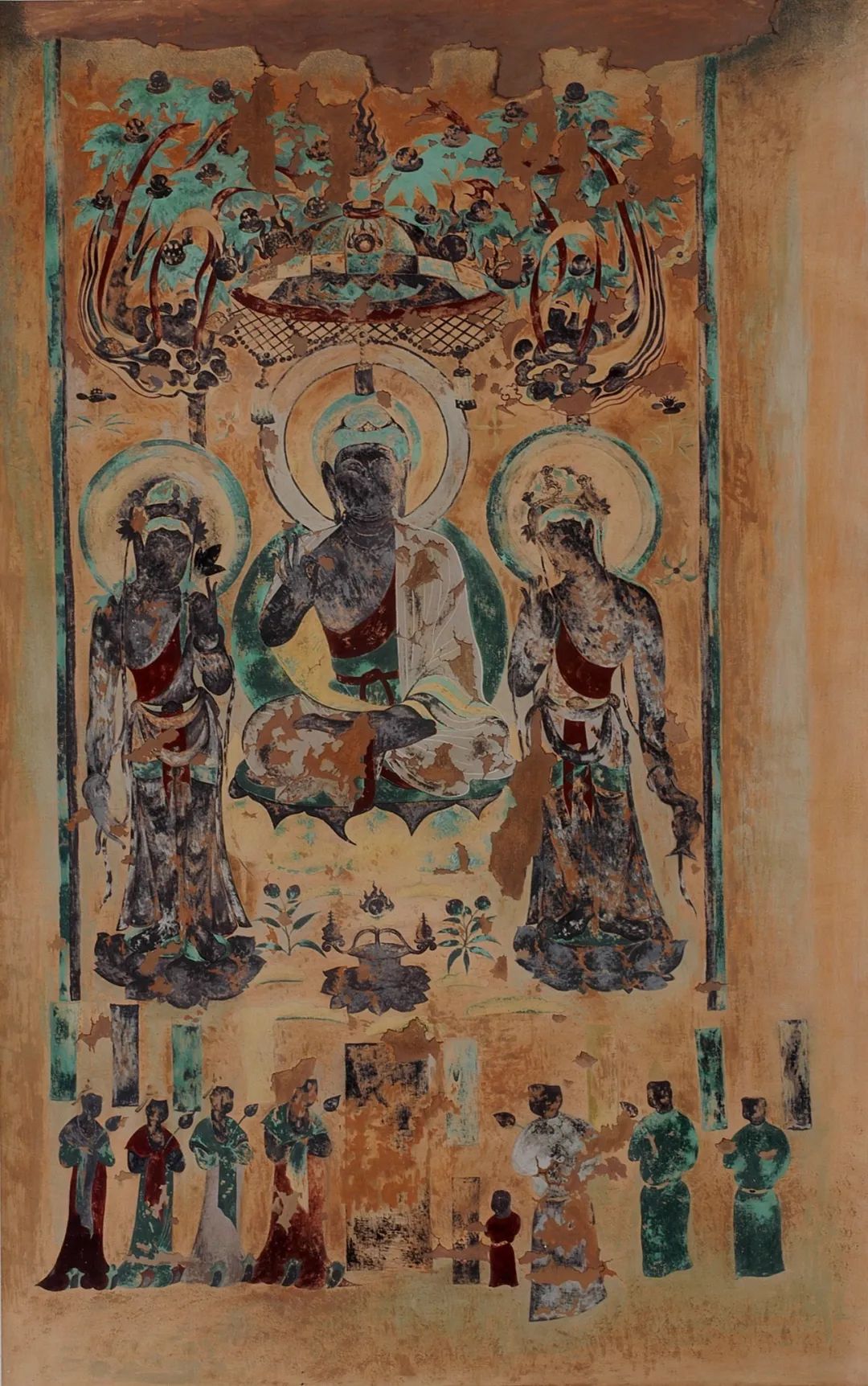 此外,第4窟后室大龕之間的墻壁上方保存有多幅唐代繪制的佛說法圖、供養(yǎng)菩薩、跪拜供養(yǎng)人形象。造像題材以一佛二弟子二菩薩組合為主,兼有傳統(tǒng)的三佛造像。