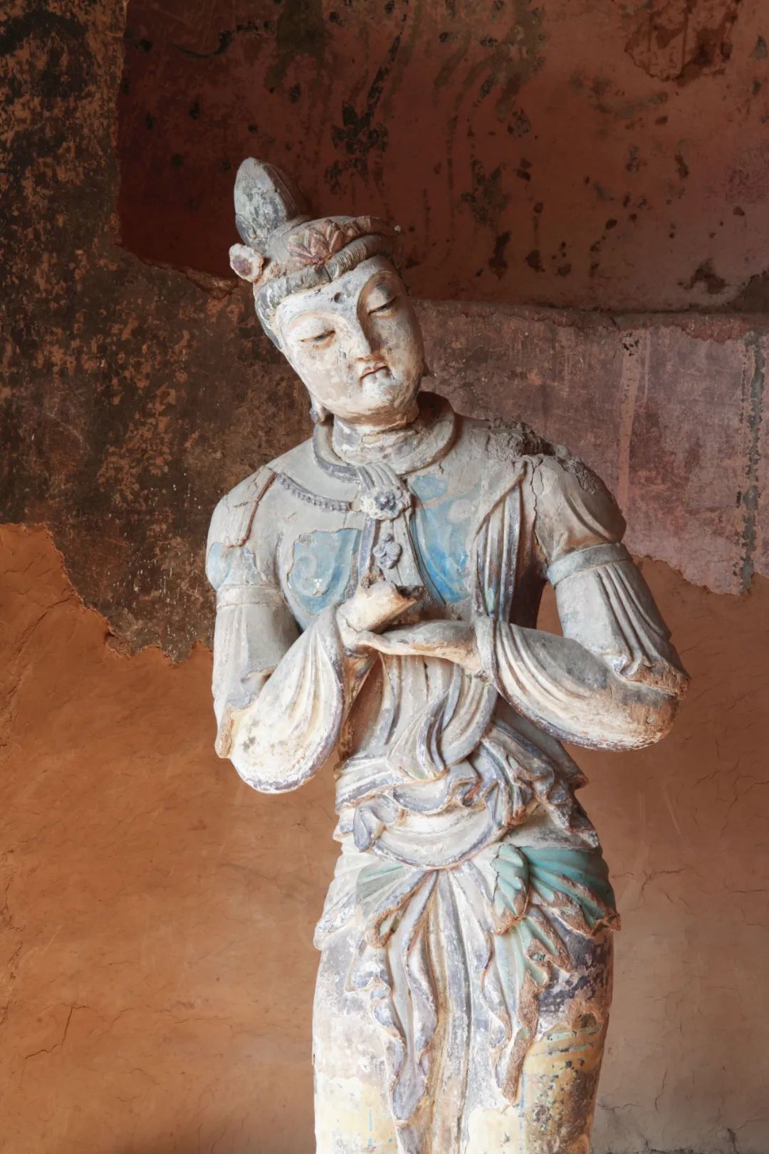 從題材上看,以單尊佛、菩薩、力士等為主,風(fēng)格上更具有寫實(shí)性。造像面相橢圓飽滿,斜眉吊目,懸鼻小口,表情森嚴(yán)、凝重,服飾簡潔、質(zhì)樸,寬博厚重,極富質(zhì)感。其中佛低平螺髻,前置肉髻珠,身穿垂領(lǐng)袈裟。菩薩束發(fā)高髻或戴風(fēng)帽,眉目慈祥,身材比例協(xié)調(diào)、準(zhǔn)確。力士表情生動傳神,體形孔武雄健,充滿陽剛之氣,給人以強(qiáng)烈的力量和威武感;這段時間造像前衰后盛也與當(dāng)時秦州所處環(huán)境有密切關(guān)系。