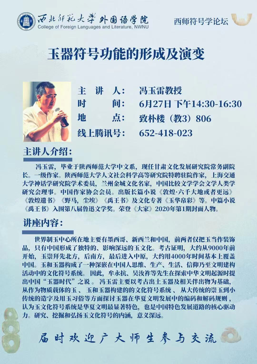 由甘肅文化發(fā)展研究院常務(wù)副院長、一級作家馮玉雷主講的《玉器符號功能的形成及演變》將于6月27日下午在西北師范大學(xué)舉辦。此項(xiàng)活動是西北師范大學(xué)外國語學(xué)院西師符號學(xué)論壇系列講座之一,旨在促進(jìn)玉文化與符號學(xué)的融合研究。