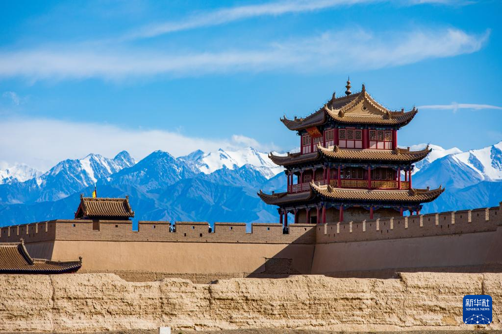 當日,位于甘肅河西走廊的嘉峪關(guān)市在一場疾風(fēng)驟雨后,天空放晴,遠處祁連雪山與嘉峪關(guān)關(guān)城交相輝映,構(gòu)成一幅壯美畫卷。