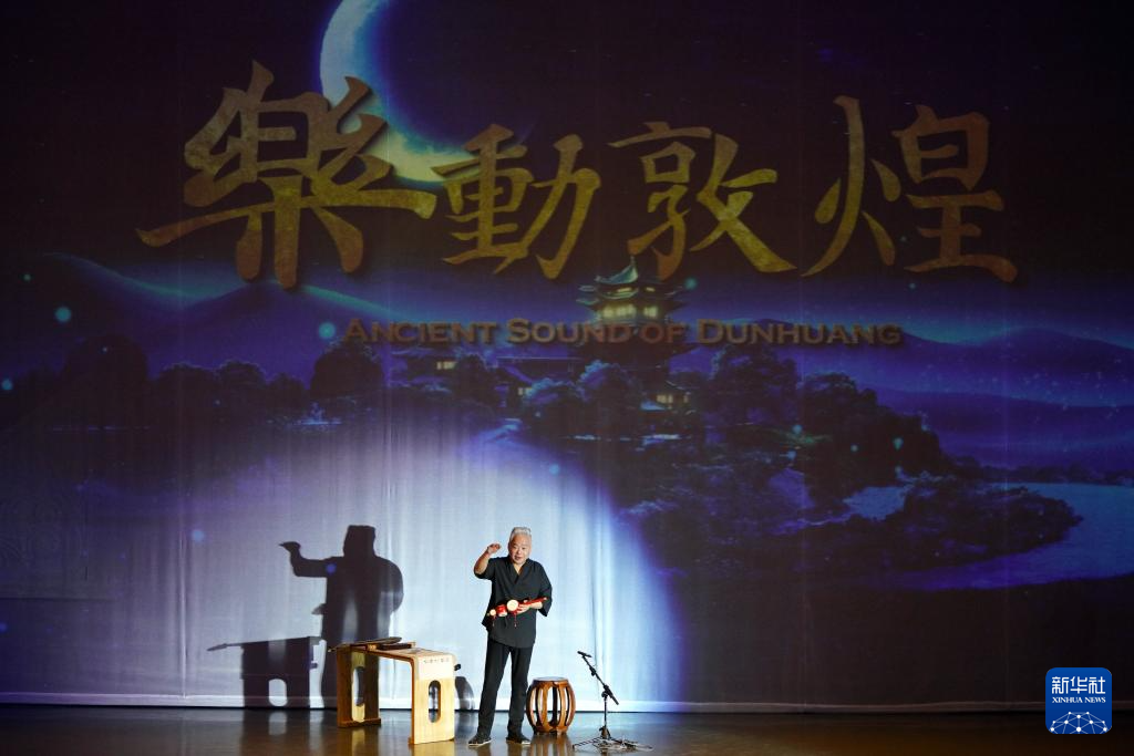 8月9日,在《樂(lè)動(dòng)敦煌》演出現(xiàn)場(chǎng),敦煌古樂(lè)全球推廣大使、國(guó)樂(lè)藝術(shù)家方錦龍?jiān)谙蛴^眾介紹傳統(tǒng)音樂(lè)。新華社記者 馬寧 攝