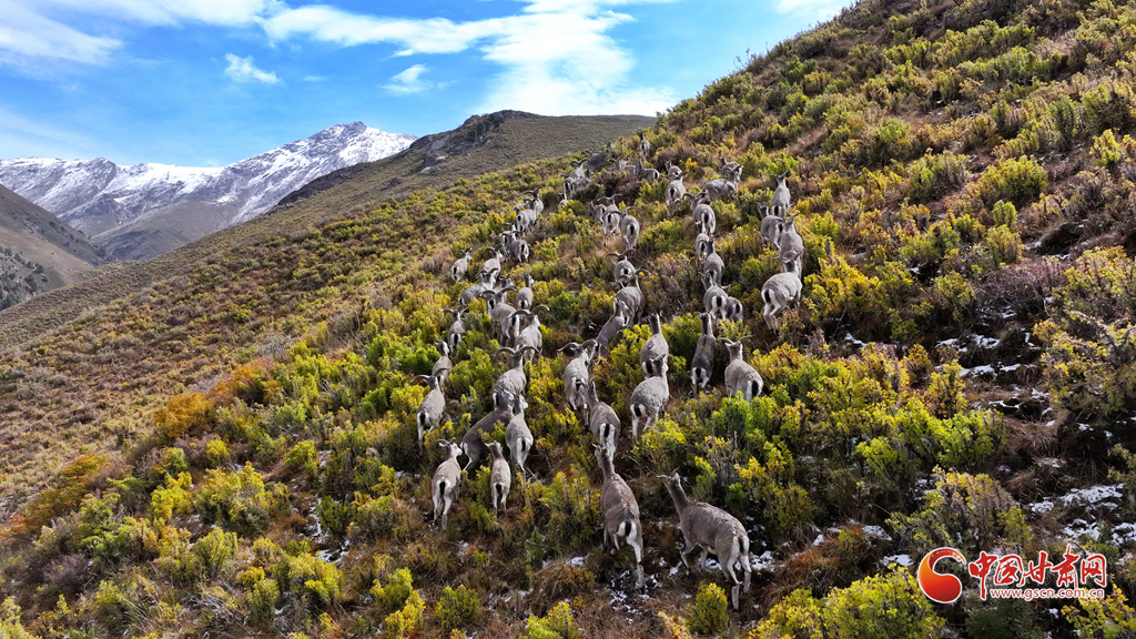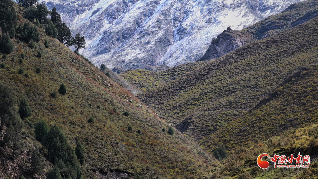 9月25日,位于甘肅省河西走廊的張掖市山丹馬場秋日初雪,遠(yuǎn)處的祁連山上積雪與松柏交相輝映,巖羊在雪地里悠閑覓食,宛如一幅和諧的生態(tài)畫卷。