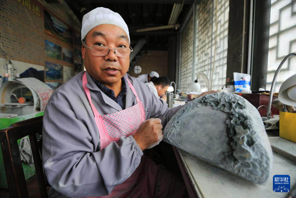 10月24日,藝人在甘肅省定西市臨洮縣洮硯藝術(shù)館打磨洮硯。新華社發(fā)(王克賢 攝)