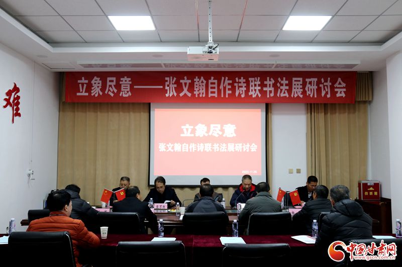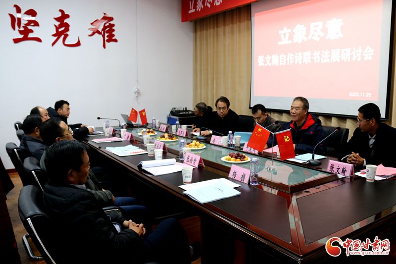 11月26日下午,“立象盡意——張文翰自作詩聯書法展研討會”在華夏文明導報社舉行。甘肅省委宣傳部文藝處處長李樂,中國作家協會會員、甘肅省作家協會副主席牛慶國,中國書法家協會會員,甘肅省書法家協會副主席張萬勝出席研討會,來自蘭州大學、西北師范大學的教授、學者20余人參加會議。
