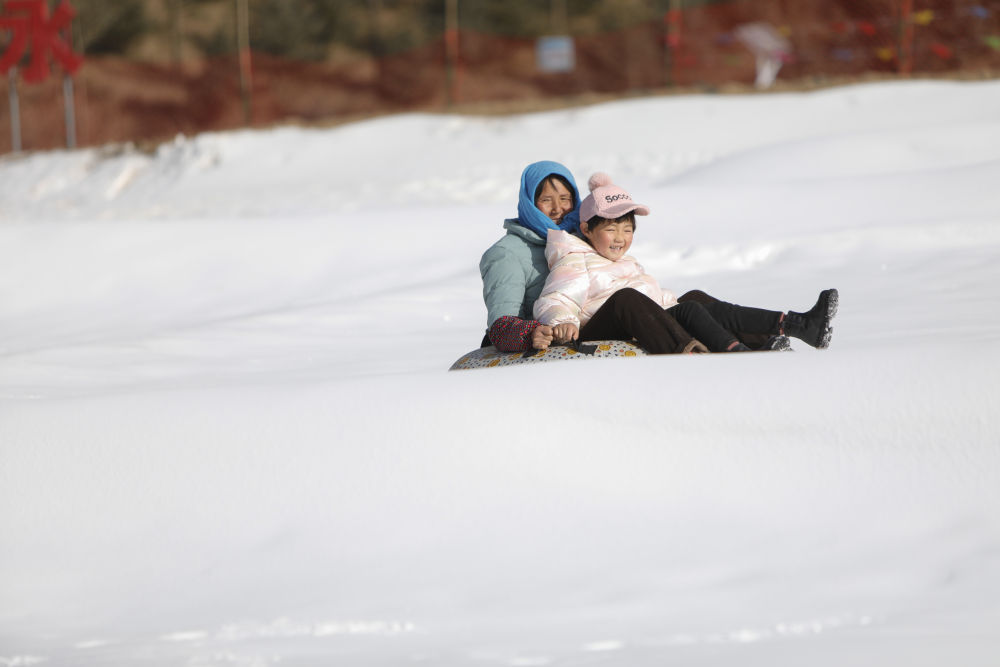 1月16日,在渭源縣田家河鄉(xiāng)元古堆村冰雪樂(lè)園,游客在滑雪圈。新華社記者 方欣 攝