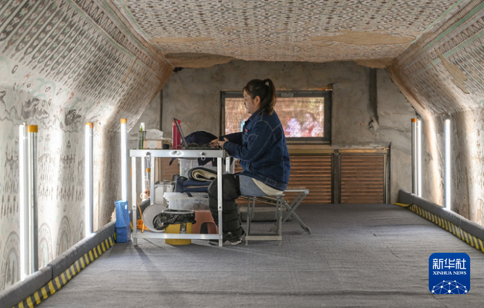 在敦煌莫高窟正在保護修繕的第55窟內,一位文保工作者對采集的數據進行整理(2023年8月3日攝)。新華社記者 李賀 攝