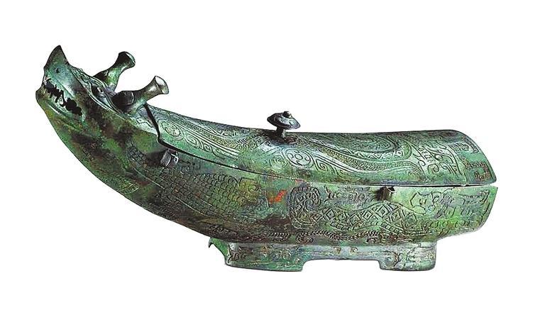 陜西寶雞出土的逨盉,酷似現(xiàn)代的扁圓形壺,器身呈扁圓形,長(zhǎng)方形口上有鳳鳥(niǎo)形蓋。鳳鳥(niǎo)引首高昂,喙微卷曲,振翼欲飛。器身與蓋用虎形鏈及雙環(huán)相連,虎作向上爬行狀,頭左偏而尾上卷。直管狀流,流端作龍首狀。鋬呈龍首向下噴水狀,下有四獸足。腹部?jī)蓚?cè)紋飾相同,分別由三圈組成,由外向內(nèi)依次為變體夔龍紋、重環(huán)紋和蟠龍紋。逨盉是祭祀禮器,它將天上飛的鳳鳥(niǎo)、地上跑的猛虎、水里游的蛟龍,作為溝通天地、人神的使者,使天地人三者合而為一。由于周人將動(dòng)物視為具有無(wú)限神力之神靈,因此青銅器上之動(dòng)物紋樣,除宗教祭祀意涵外,也富有一定的政治意義。貴族通過(guò)青銅器上神秘肅穆的動(dòng)物紋樣,令人望之崇敬生畏,以威嚇被統(tǒng)治者,達(dá)到鞏固本身地位及權(quán)威之目的,同時(shí)也含有龍騰虎躍鳳呈祥的美好寓意。