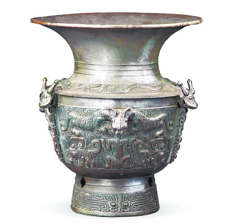 中國(guó)國(guó)家博物館收藏的龍虎紋青銅尊,高50.5厘米,重26.2千克,為一件體形較高大的盛酒器。青銅尊肩部以圓雕和浮雕相結(jié)合,塑造3條生動(dòng)的蟠龍形象,龍身蜿蜒,龍首探出,額有雙角,闊吻巨口,兩眼大睜。腹部紋飾為一個(gè)虎頭兩個(gè)虎身,虎口之下有一人形,人頭銜于虎口之中?;⑸硐路揭造槔鉃榻?,飾兩夔龍相對(duì)組成的獸面。從主體花紋看,龍、虎、人造型莊嚴(yán)穩(wěn)重、奇特神秘,特別是龍頭和虎頭用澆鑄法從外壁突兀凸起,雄健粗獷,比起用高浮雕法更具有一種威武逼人的悍氣。龍虎尊圓形大口表示上天,肩部神龍游蕩于空中;猛虎張牙舞爪守護(hù)大地。龍虎尊的鑄造采用十八塊母范經(jīng)兩次焊接而成,渾然一體,毫無(wú)痕跡。整器工藝精湛,花紋線(xiàn)條洗練,是商代青銅器中的精品。