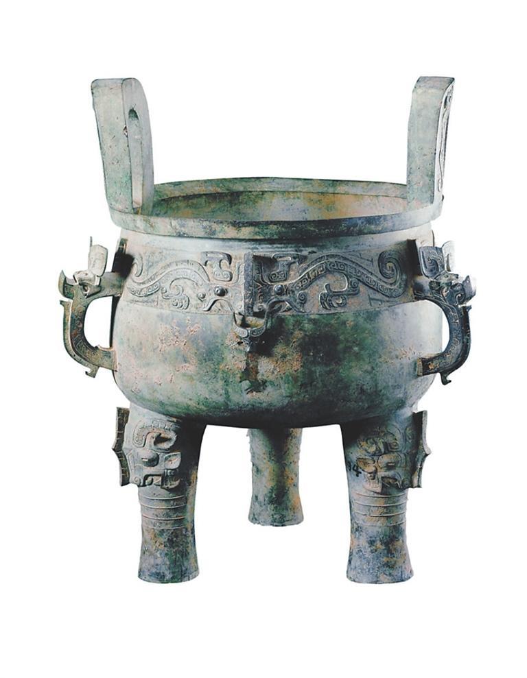西周最大的圓鼎是陜西歷史博物館收藏的淳化大鼎,造型魁偉、深厚凝重,其造型基本保持了商代晚期胎壁寬厚、形體恢弘、凝重壯闊的風(fēng)格。大鼎通高122厘米,口徑83厘米,耳高28.6厘米,腹深54厘米,重226千克,是迄今世界上最大、最重的西周青銅器,也是迄今出土的西周圓鼎中最大者。淳化大鼎因體形太大太重,除口沿上有兩耳外,器身腰部亦有三耳,形如酒器中的銴。一般的鼎,大多只有口沿耳。淳化大鼎腰部三只獸首屈舌銴,為以往出土銅鼎所未見(jiàn),故又名為獸首屈舌銴鼎、獸面紋五耳鼎。除了獨(dú)特的三耳,淳化大鼎腰部的龍紋和獸面紋的結(jié)合也很有特色。三面各有兩只夔龍,與中間的扉棱組合在一起看,則形成了一張由扉棱為鼻的獸面,即饕餮紋。三張獸面的扉棱下各有一只逼真的牛首浮雕,如同饕餮欲吞食牛,起威懾之用,所以也稱(chēng)牛首夔龍紋鼎、龍紋鼎等。