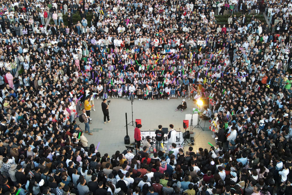 4月23日,在蘭州市城關區(qū)的黃河蘭州段近水平臺,市民及游客參與“蘭州黃河大合唱”活動(無人機照片)。新華社記者 范培珅 攝