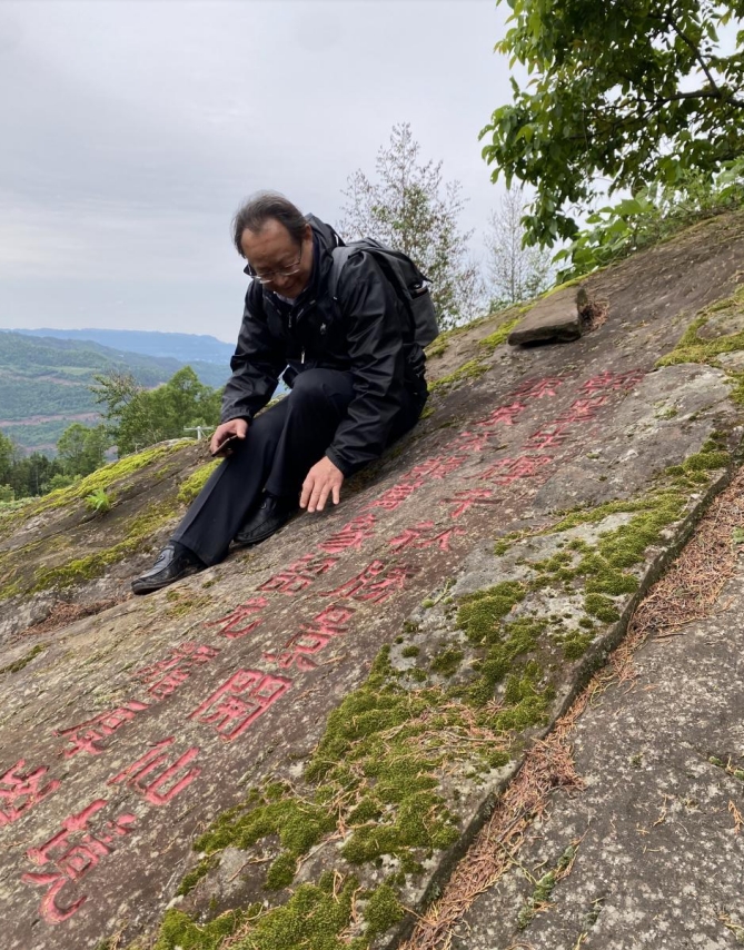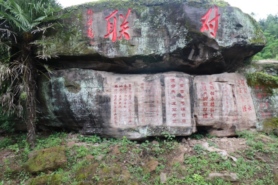 山上隨處是石,或臥或立,俱有雄獅虎豹之勢(shì);或平或峻,皆作岡陵之態(tài)。青峰續(xù)脈,絕頂鷹飛。鑿巖壁以造法像,栩栩如臨宮闕;摩巨石而鐫嘉聯(lián),文華直射牛斗。石多瑰偉,苔覆璞瑜,油菜花點(diǎn)綴其間,引來(lái)蜜蜂蝴蝶共舞。山茶與毛竹同畦,郁郁蔥蔥;峰巒與云煙共養(yǎng),莽莽蒼蒼。遇目石上鐫字,瀏賞翰墨煙霞;振藻揚(yáng)毫,皆寰中俊杰;椽筆斯文,多隴蜀賢達(dá)?;虺嘧痈文?,燭照于史;或凜然浩氣,嘯傲大千。聯(lián)壁生輝,文曲星彰;峣巖開(kāi)竅,氣通神明。文采煥然與星河同輝,詩(shī)儕競(jìng)秀潤(rùn)厚山玉顏。壯懷詩(shī)夢(mèng),漱玉溪流。在一塊巨石斜面上,有同伴發(fā)現(xiàn)刻有筆者所書(shū)長(zhǎng)聯(lián),興奮得喊叫起來(lái)。這是三年前應(yīng)曹興章先生之約而作,聯(lián)曰:翰墨生輝,千秋勝景開(kāi)仙境;源泉流韻,萬(wàn)象韶光耀厚山。我用手指扣去筆畫(huà)生出的茂密青苔,坐下來(lái)與我的聯(lián)合影留念。信是蓮花開(kāi)石上,遙遙至此結(jié)仙緣。