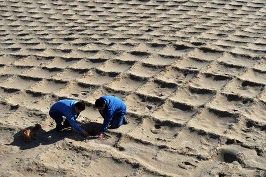 記者從敦煌研究院了解到,到2014年,經(jīng)過(guò)70年持續(xù)風(fēng)沙治理,風(fēng)沙對(duì)敦煌莫高窟的危害顯著降低,進(jìn)入窟區(qū)年積沙量減少85%以上。據(jù)敦煌研究院保護(hù)所副所長(zhǎng)汪萬(wàn)福介紹,在幾代治沙人的努力下,莫高窟頂已形成由防沙障阻沙、沙生植物林帶擋沙、麥草方格沙障固沙和礫石壓沙組成的風(fēng)沙防治綜合體系,極大減緩了風(fēng)沙對(duì)敦煌壁畫和塑像等文物的危害,改善了窟區(qū)生態(tài)環(huán)境。圖為2014年8月29日,兩名工作人員檢查用于固沙的麥草方格。新華社記者陳斌攝