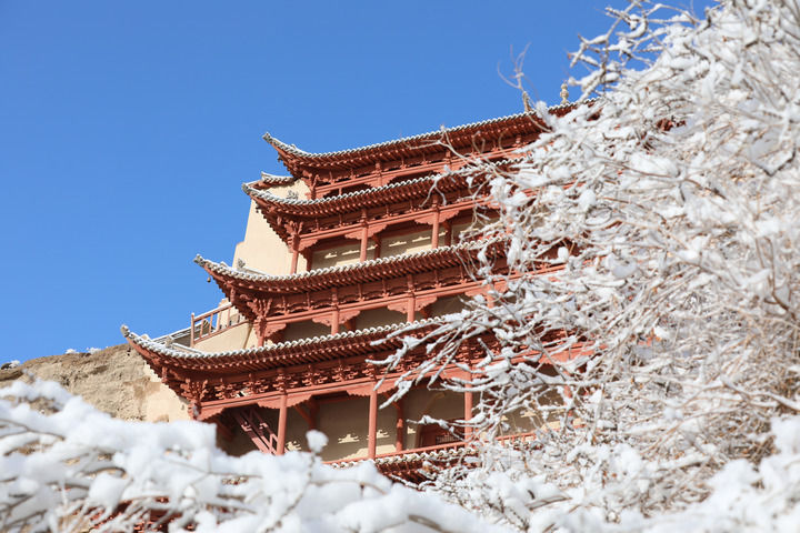 2022年3月24日至25日,甘肅省敦煌市迎來(lái)一場(chǎng)春雪。雪后的世界文化遺產(chǎn)敦煌莫高窟銀裝素裹,景色如畫。圖為3月25日拍攝的雪后的敦煌莫高窟景區(qū)九層樓。新華社記者李俞輝攝