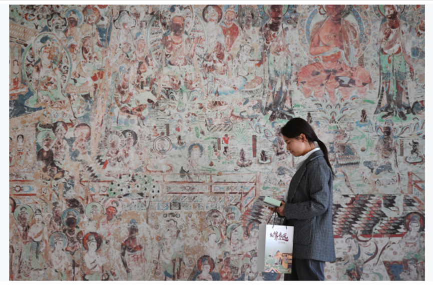 圖為敦煌研究院文物數(shù)字化保護(hù)團(tuán)隊(duì)創(chuàng)意營(yíng)銷人員廖雪婷從一幅高保真復(fù)制壁畫前走過(guò)(2023年4月25日攝)。新華社記者陳斌攝