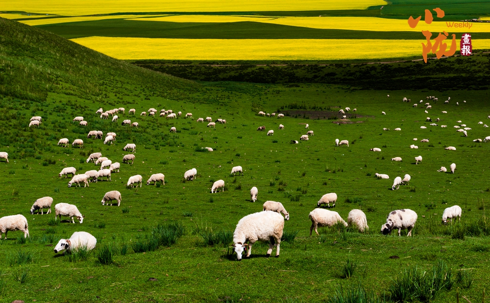 一眼望去,碧綠一片,風(fēng)景秀美。羊群放牧于焉支山下的大草原上,金黃的油菜花、無(wú)邊的草原,氣勢(shì)壯觀。