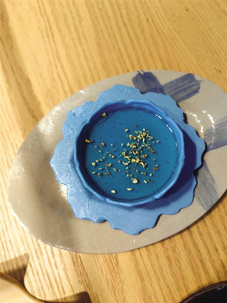 拿起一塊甜品,省博物館的鎮(zhèn)館之寶之一——“琉云璃彩”藍蓮盞近在眼前,“冰肌玉骨”的七瓣之蓮,顏色高貴的蓮花形托盞,果凍狀甜品上桂花飄香。你肯定想不到,這是一款通體可食的低糖蛋糕,它像夜幕下一朵綻放的藍蓮花,以奶油為原材料。在這里,顧客是可以“吃文物”的。
