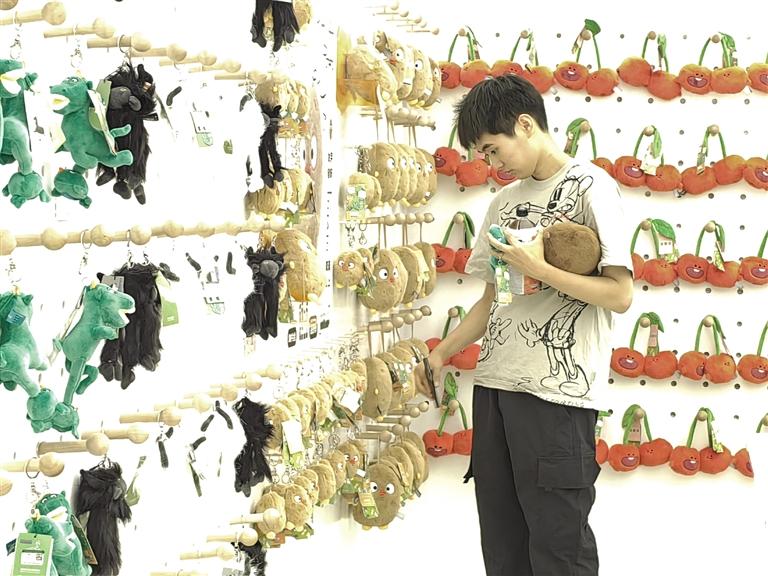 7月17日上午11時,藝術(shù)生活館內(nèi),來自西安的大學生小朱入手兩個綠馬、一個甘肅麻辣燙毛絨玩具、兩盒禮品包裝三炮臺。“送家人,送同學,都很好。我感覺這兒越逛越好玩,不虛此行。”小朱說。