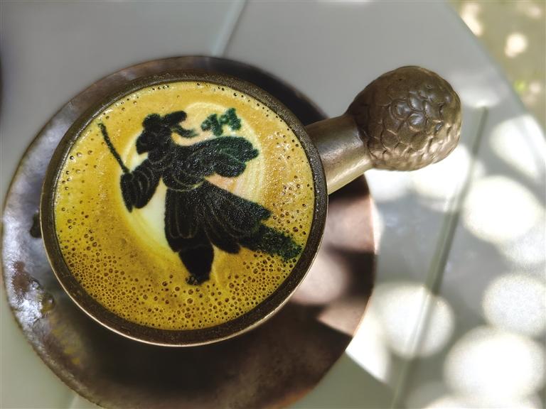 驚喜還有很多,就像店內(nèi)柜體上的一句話“可以讓大家體會到我們不一樣的用心”,這些年輕人用心起來還真能撬動地球。飲品和咖啡,設計團隊愣是把口味和地域文化結(jié)合起來,整出了幾款“限量版”:城市限定——沙橙暴飲品,西北特有;特調(diào)咖啡——苦水玫瑰特調(diào),讓人一口難忘之余還配上了臺詞,“苦水玫瑰有點甜”;“文物咖啡”更是占據(jù)“C位”,咖啡拉花機“印制”而成的微縮版銅奔馬、蛙紋罐、銅車馬等文物圖案浮在濃郁的咖啡上,精致、唯美。這還不算,咖啡器皿的名稱也非同尋常——鷹首權(quán)杖杯。陶瓷來自景德鎮(zhèn),手柄是省博鷹頭形青銅權(quán)杖首的文物原型。驚嘆、贊美、感慨,每一位品嘗之人喜愛之余竟不忍飲用。