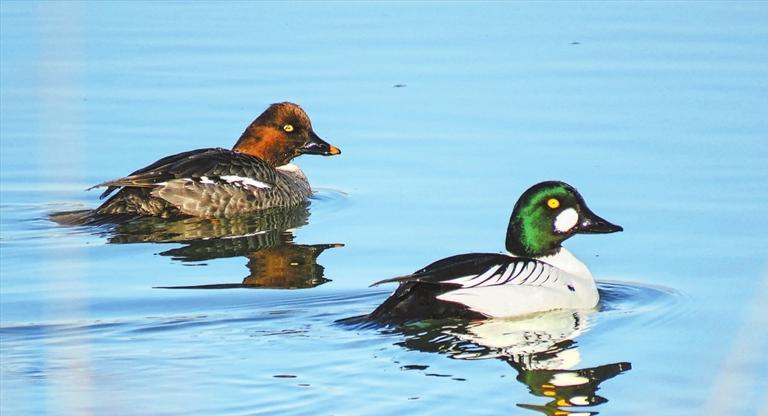 鵲鴨同樣喜好潛水,但主要在追蹤小魚和水生昆蟲。雖然只是中等體型,它卻有個(gè)大大的腦袋,仿佛戴了一頂帽子。在雄鴨墨綠色的頭上,明黃色的眼睛前下方生出個(gè)白色圓斑,頗顯呆萌。體羽則黑白相間,故得“鵲”名。
