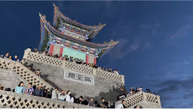 夕陽西下,夜色漸濃,三臺閣上游人如織,山下的萬家燈火隨著夕陽余暉的隱退漸漸蘇醒,一盞盞燈光次第亮起,璀璨如星海。人們紛紛舉起手機(jī)和相機(jī),記錄下這一刻的美好。“真不愧是金城蘭州,站在這里俯瞰蘭州是什么神仙視角!”“終于知道夜晚的蘭州為啥被稱作‘蘭哈頓’了,回去好好跟朋友炫炫……”來自陜西的大學(xué)生小劉和他的小伙伴們一邊尋找拍照最佳角度,忍不住發(fā)出贊嘆。在這一刻,古老的閣樓與游客一起沉醉在蘭山的夏夜晚風(fēng)中?!?/p>