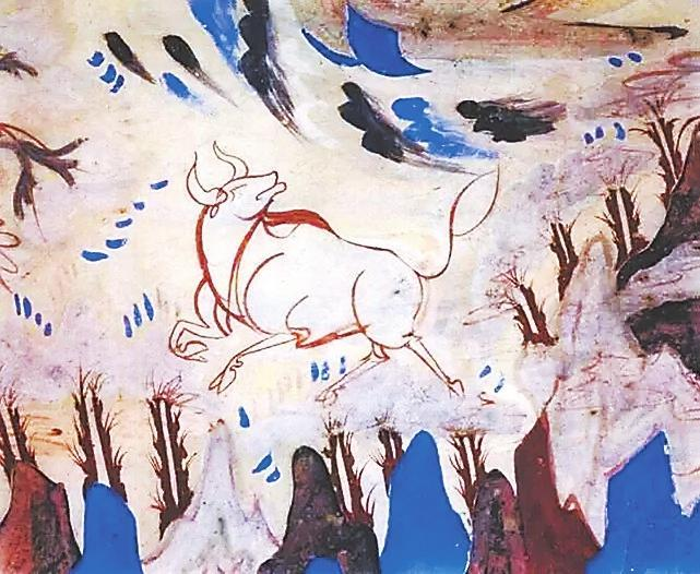 在莫高窟第454窟壁畫中有一幅“耕牛圖”:畫面刻畫了一頭正在勞作的耕牛。畫師用土黃色作為畫面的主色調(diào),將正在馭牛的人只是寥寥數(shù)筆勾勒其形體而已,卻用了醒目的赭紅色來(lái)表現(xiàn)一頭牛正在使盡全身力氣耕耘的形象。透過(guò)畫面我們能感知到這是一頭“不待揚(yáng)鞭自?shī)^蹄”的老黃牛。除了描繪在農(nóng)耕生活中勤勤懇懇的耕牛,敦煌壁畫中還描繪了其他形形色色的牛。在莫高窟第249窟壁畫中有一幅“受驚的野牛圖”,畫面上刻畫了一群在山林間閑庭信步的野牛,它們神色安詳自若。忽然一只矯健的猛獸疾馳而至,其中一頭牛受驚回首。這些均被技藝精湛的畫師惟妙惟肖生動(dòng)勾勒而出。我們看到一只肌肉健碩、神態(tài)生動(dòng)的野牛幾乎要從壁畫中呼之欲出,令人唯恐避之不及。還有在莫高窟第61窟壁畫中有一幅“金牛宮圖”,這是“黃道十二宮”中的其中一幅圖。所謂的“黃道十二宮”就是今天所說(shuō)的十二星座,畫面中的金牛體態(tài)豐滿,神態(tài)安詳,牛的敦厚忠誠(chéng)、樸實(shí)溫馴、勤勉勞作、默默無(wú)聞的精神贏得了人們的信任。