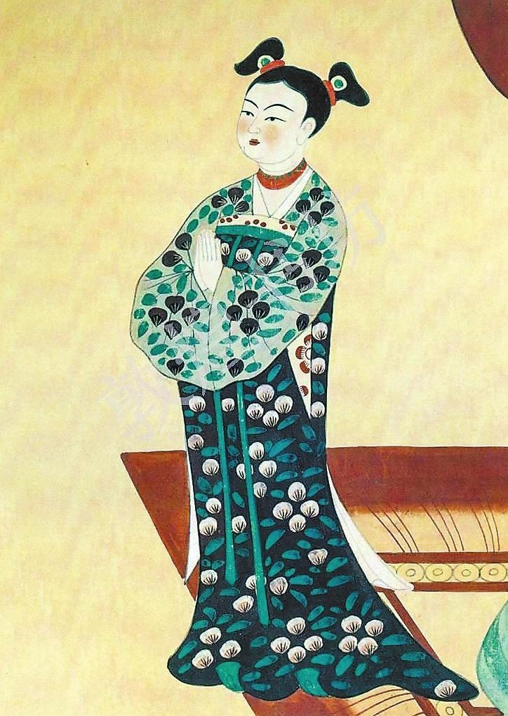 我們都知道服裝最經(jīng)典的配色是黑白灰,尤其是黑白配,其實(shí)這種配色也是敦煌壁畫中的經(jīng)典。在莫高窟第100窟壁畫中有一幅“舞者圖”:畫面上男舞者被定格在一個(gè)扭腰送胯雙臂屈伸的舞蹈動(dòng)作中,他上身穿著中長(zhǎng)款的黑色圓領(lǐng)長(zhǎng)袖缺胯衫,用白色帛帶束腰。下身則搭配一條白底團(tuán)花大口褲。在莫高窟第12窟壁畫中有一幅“供養(yǎng)人圖”:畫面上一對(duì)母女身著襦裙,上襦下裙的著裝風(fēng)格相當(dāng)于今天服飾的無(wú)袖連衣裙加一件長(zhǎng)袖開衫。在畫面上女兒的上衣和媽媽的裙子是同樣的藍(lán)色,女孩的裙子和媽媽上衣是同為赭色,只不過(guò)各自的花紋樣式不同,但是母女倆胸前的結(jié)帶卻是同色同花、一模一樣。畫師如此別出心裁的呼應(yīng),顯得既溫情又醒目。